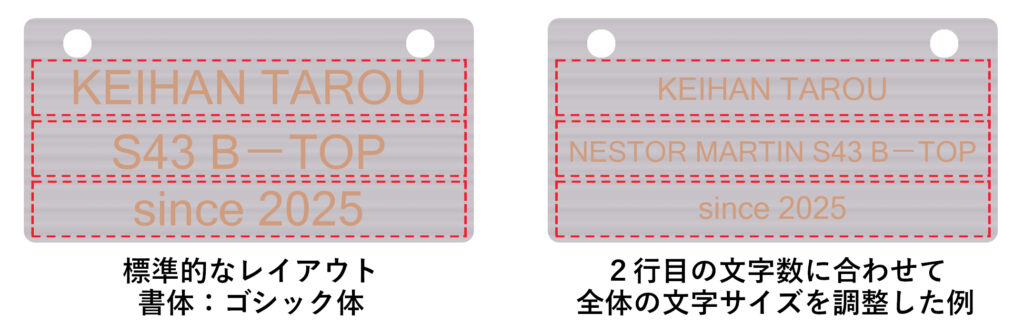 文字を刻印可能な範囲はプレート内に三行が基本となります。
