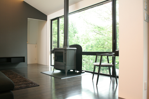 豊かな山の自然を望む、大きな窓の中央にストーブを設置しました。