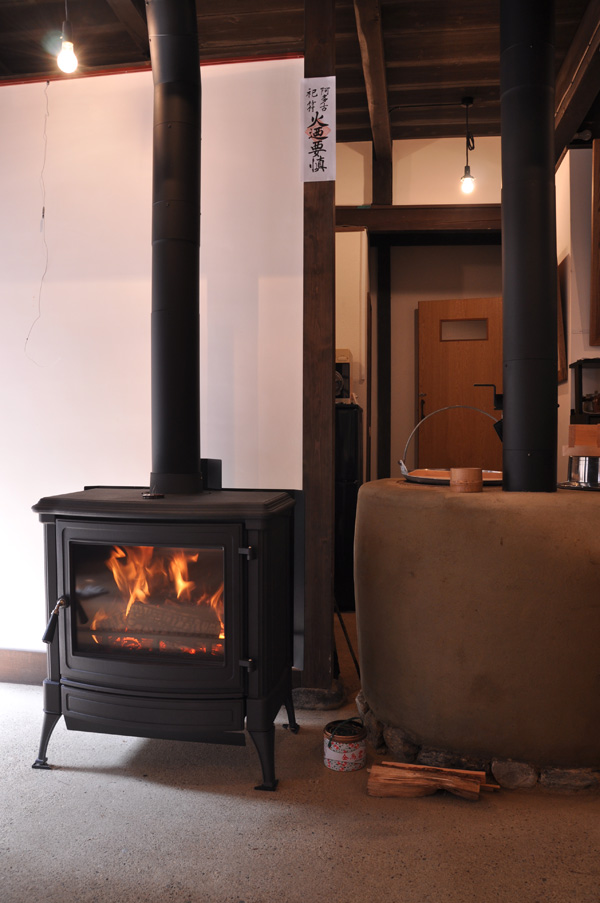 京都・嵯峨野にあるギャラリーTerra(清滝テラ)。古民家を改修した、赤いベンガラ色の建物です。おくどさんとS43がギャラリーの中心に据えられています。